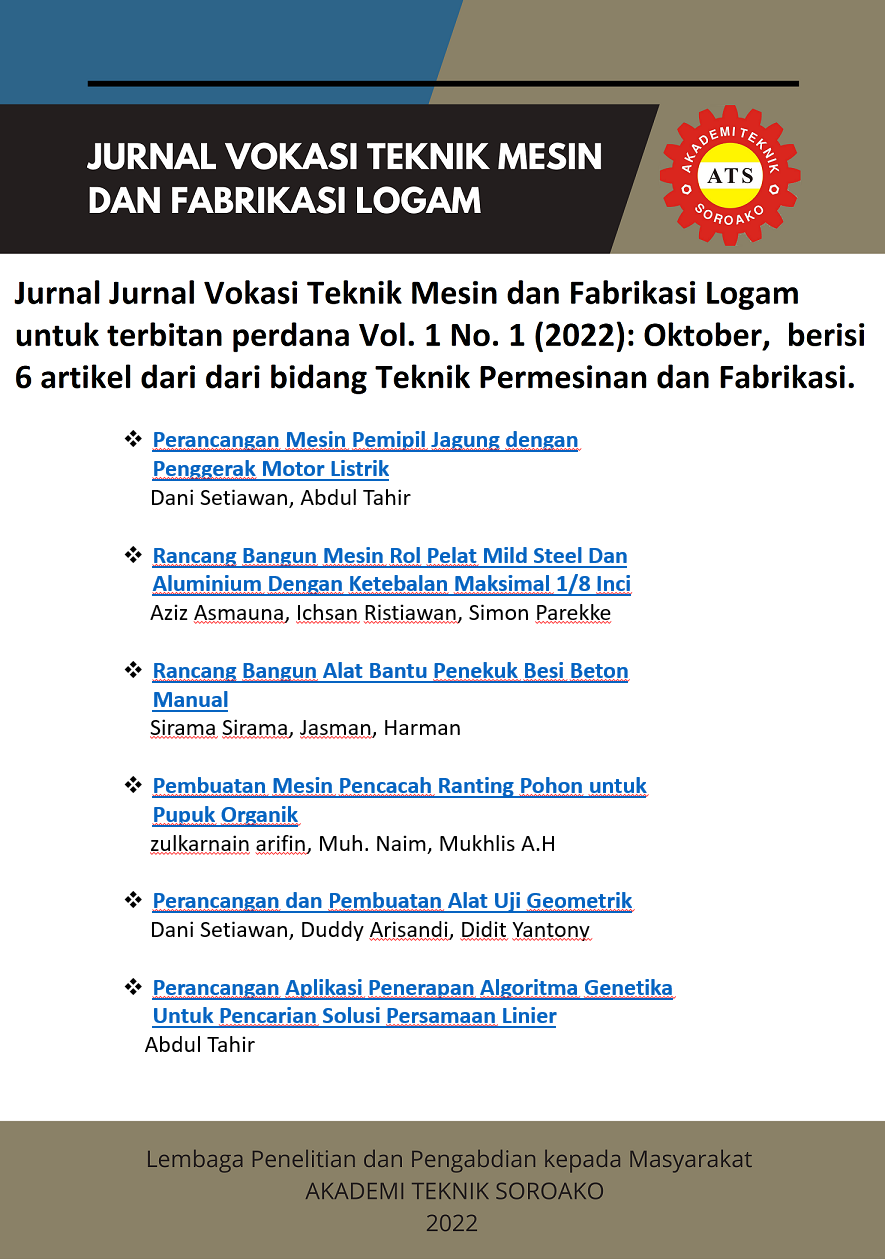 Vol. 2 No. 2 (2023)Jurnal Vokasi Teknik Mesin dan Fabrikasi Logam, Untuk terbitan Vol. 2 No. 2 (2023): Oktober, berisi sejumlah artikel dari dari bidang Teknik Permesinan dan Fabrikasi.